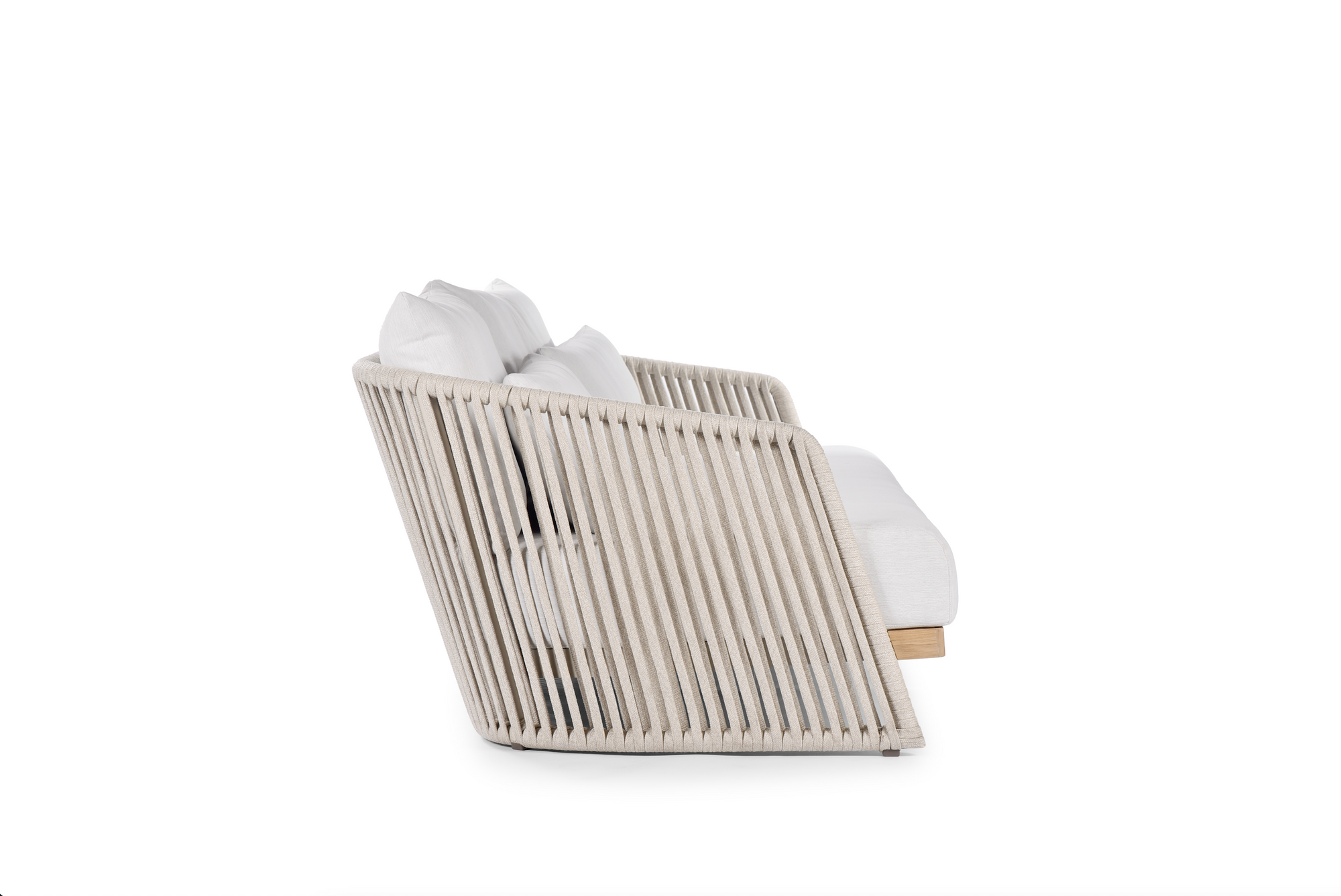 The Covo Sofa features a powder-coated aluminum frame, woven rope detailing, Sunbrella® performance cushions, and durable outdoor-rated components selected for long-term use.